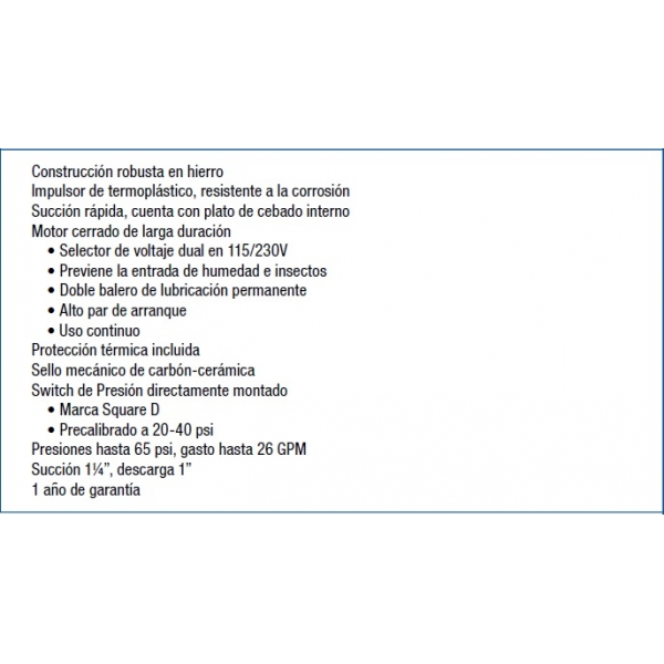 La bomba serie QD es del tipo Jet de alta velocidad de succión, para pozo somero (de baja profundidad). Se usa para bombear agua de cisternas, en sistemas de presión de instalaciones residenciales, en granjas y para jardinería. Tiene las siguientes características:
