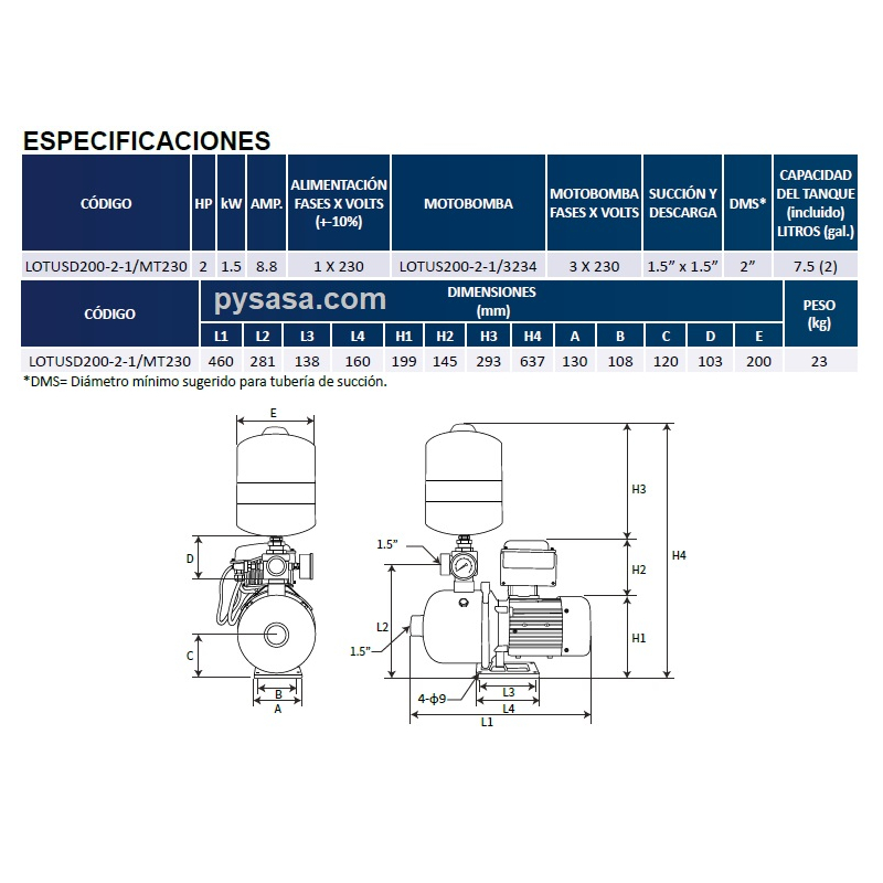 Presurizador LOTUS-DRIVE, LOTUSD200-2-1/MT23, 2.0Hp, 230Volts, 250 Lpm