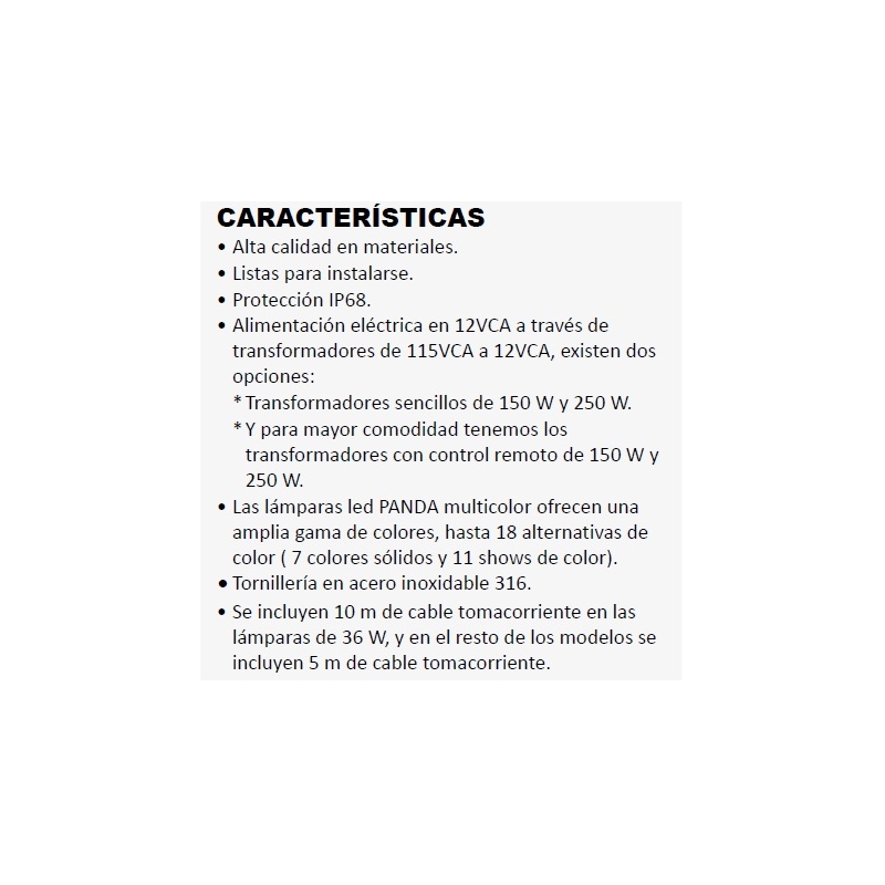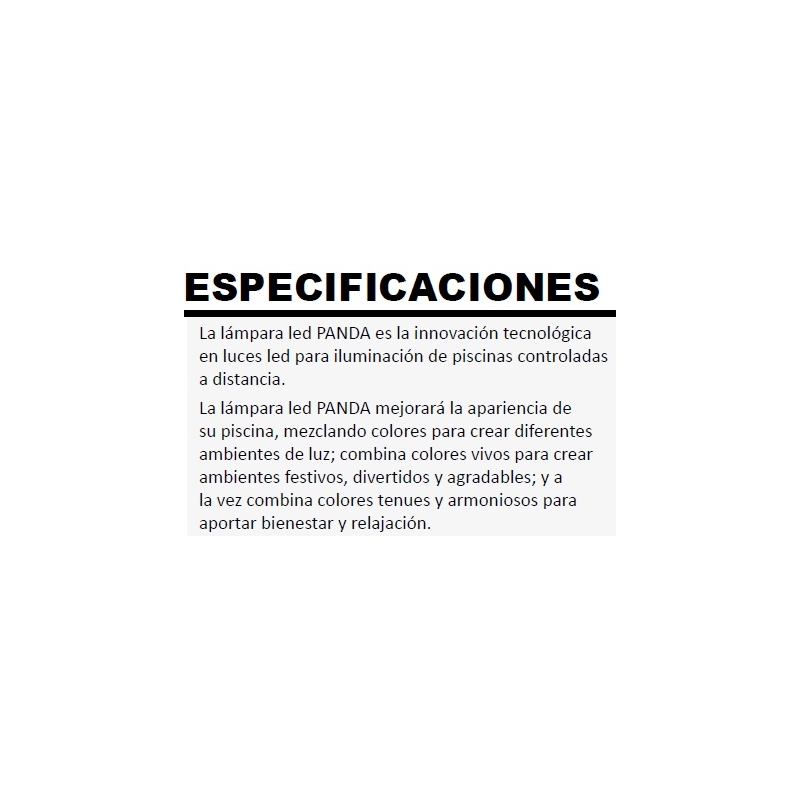 La lampara LED de Panda mejorará la apariencia de su piscina, SPA o Fuente, mezclando colores para crear diferentes ambientes de luz, combina colores vivos para crear ambientes festivos, divertidos y agradables. También combinacolores tenues que producen ambientes armoniosos, que fomentan una sensación de bienertar y relajación.