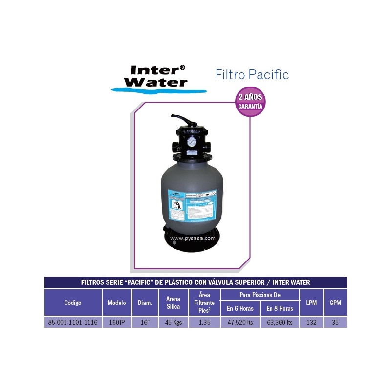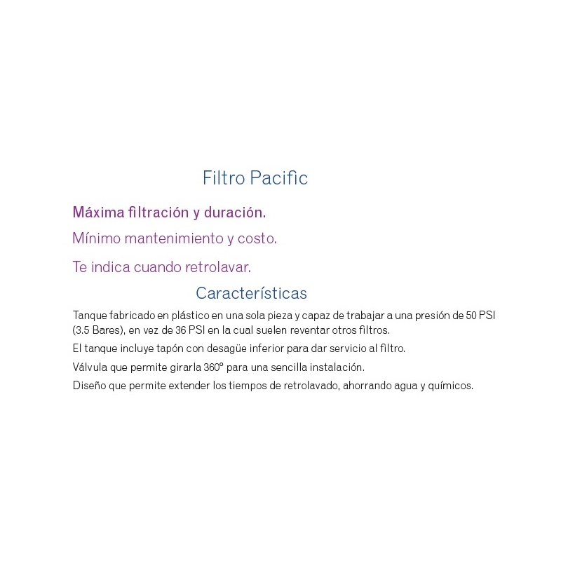 Tanque fabricado en plástico en una sola pieza y capaz de trabajar a una preción de 50PSI (3.5 Bares), en vez de 36PSI en la cual suelen reventar otros filtros.