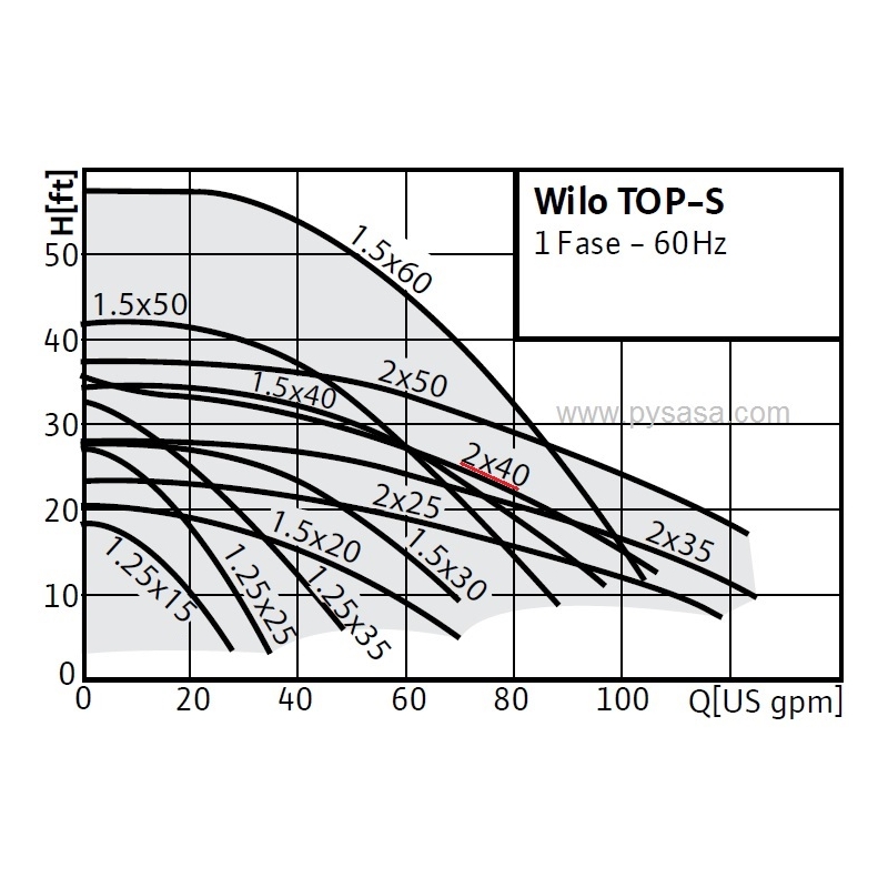 40 = Carga máxima que podrá aplicar la bomba expresada en Pies de columna de agua (Ft)
