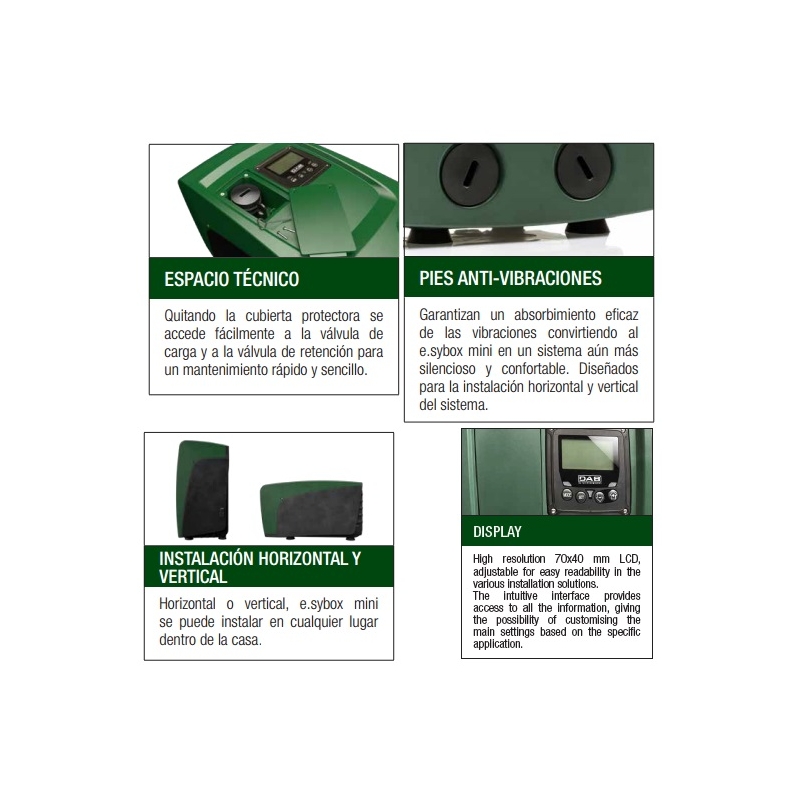 Los componentes que lo conforman son al Sistema de presión constante DAB E.SYBOX, son: Bomba Bi Turbina de auto-cebado y electrónica para el control de la presión, sensores de flujo, una pantalla orientable LCD 70x40mm de alta resolución, un variador de frecuencia y un vaso de expansión integrado de 1 litro, certificado para uso con agua potable.