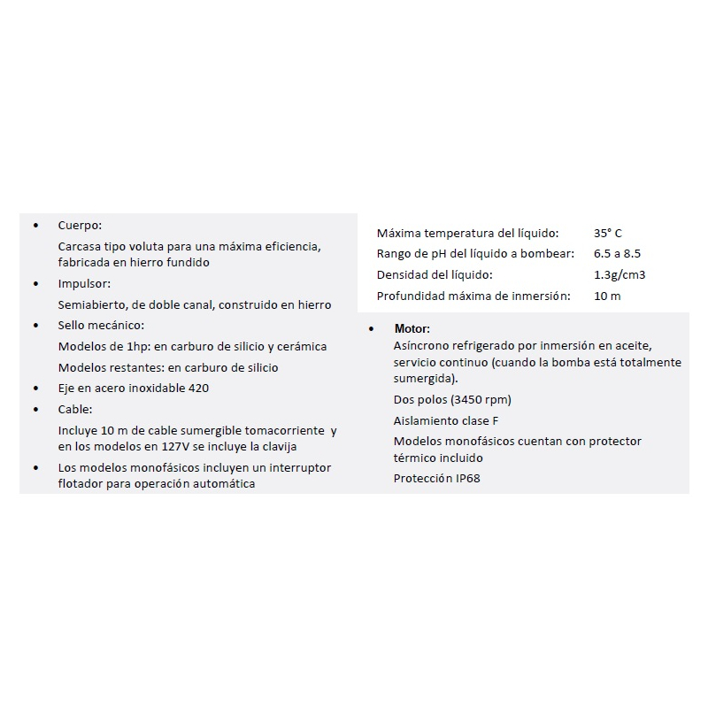 • Motor asíncrono refrigerado por inmersión en aceite, servicio continuo (cuando la bomba está totalmente sumergida), de dos polos (3450 rpm), aislamiento clase F, Protección IP68.
