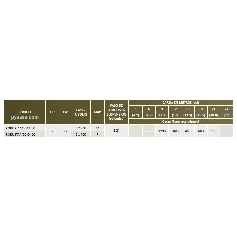 Para solicitar una bomba a 230 Volts, 3 Fase, solicite el código ROBUSTA4/50/3230
