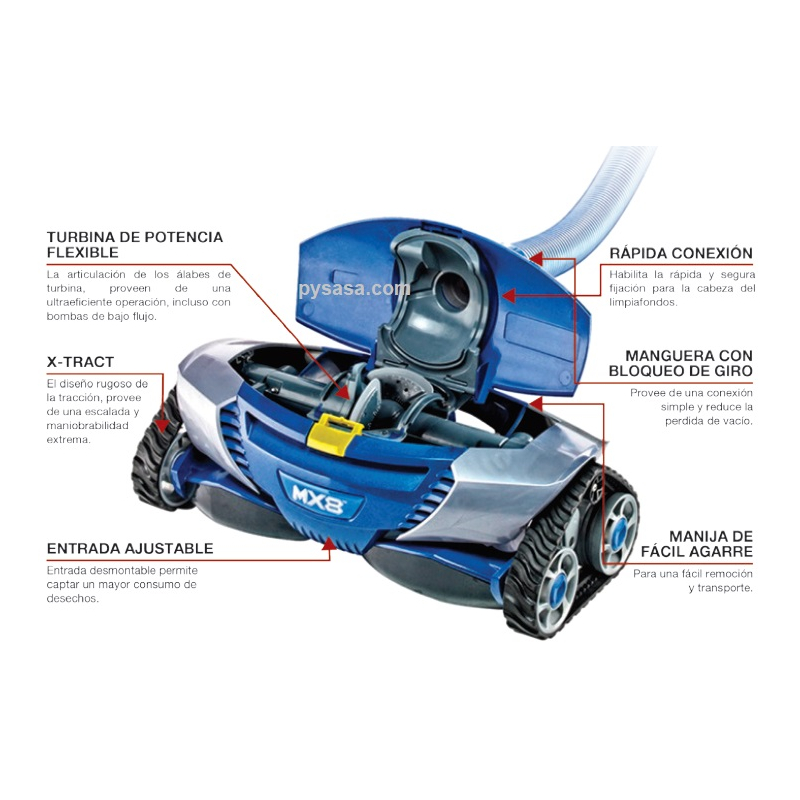 La barredora Carracuda marca Zodiaac modelo MX8, integra una tecnología que hace muy eficiente la tarea de aspirar el fondo y las paredes de la alberca, empleando la fuerza motríz de la succión de la bomba de la alberca, permitiendo la operación de la barredora sin la necesidad de conexiones eléctricas.