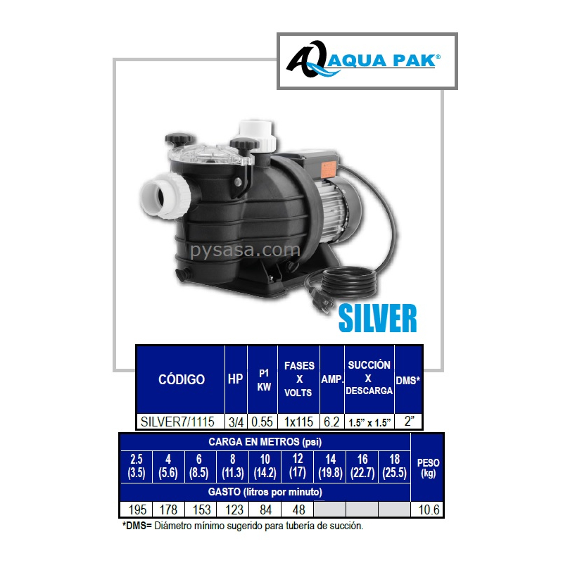 Motobomba marca Aqua Pak, Serie Silver, fabricada en Termoplástico.