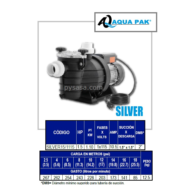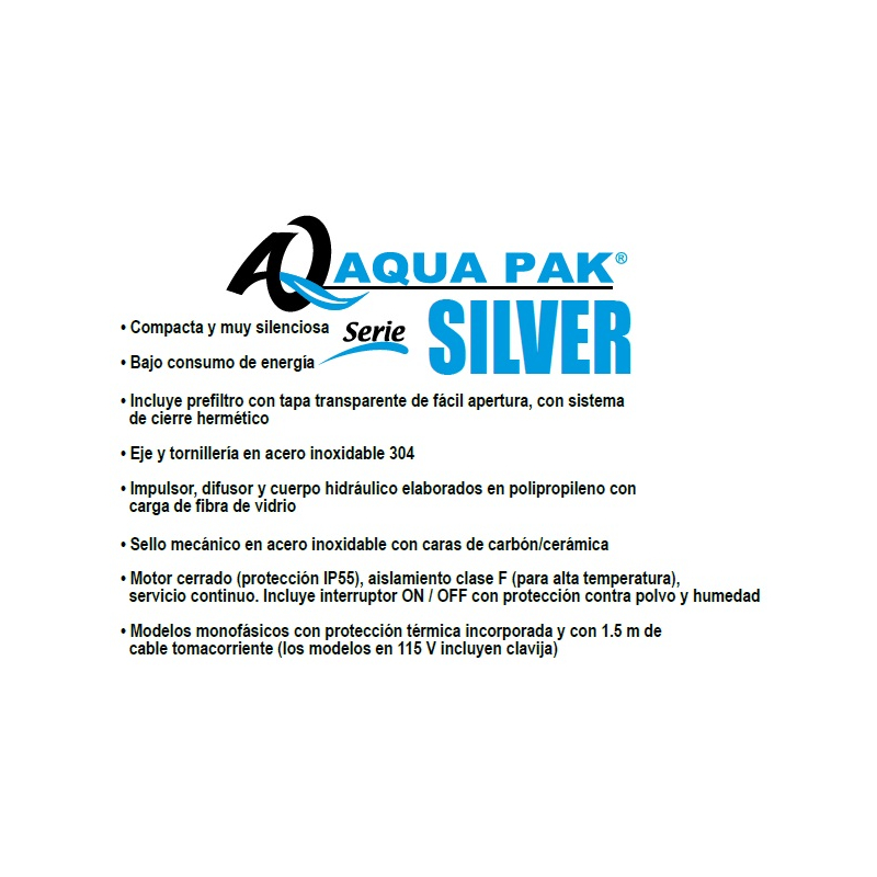 Motobomba marca Aqua Pak, Serie Silver, fabricada en Termoplástico.