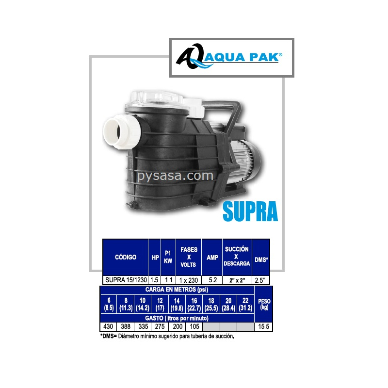 Motobomba marca Aqua Pak, Serie SUPRA, fabricada en Termoplástico.