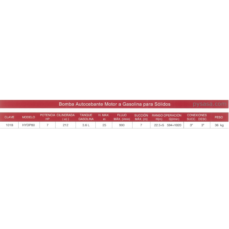 Bomba de Agua Autocebante, con motor a gasolina para manejo de s贸lidos, de 7 HP - HYDP80, 3" x 3"
