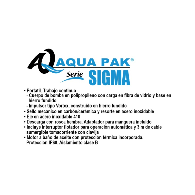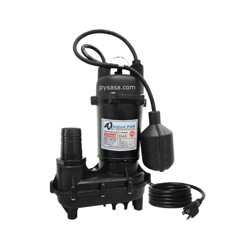 Motobomba sumergible marca Aqua Pak, para USO contínuo. Ideal para achique ya que integra un flotador de control para operación automática.