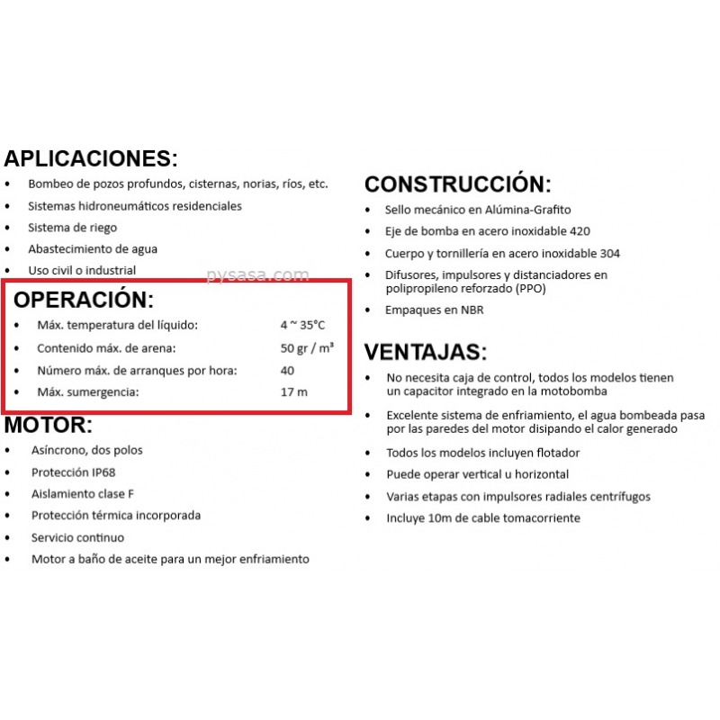 • Está diseñada con un excelente sistema de enfriamiento, ya que el agua bombeada pasa por las paredes del motor que disipa el calor generado por la operación de la bomba.