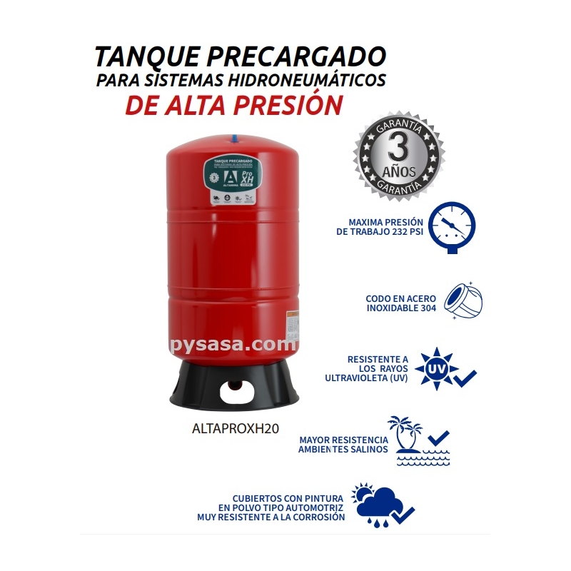 Tanque precargado vertical de diafragma marca Altamira, Serie XH, para alta presi贸n 232psi, 20 Galones
