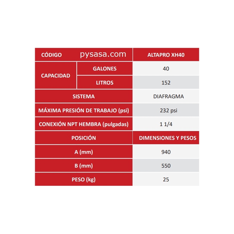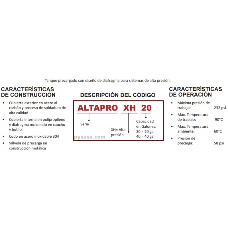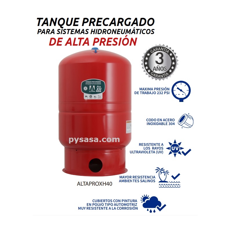 Tanque precargado vertical de diafragma marca Altamira, Serie XH, para alta presi贸n 232psi, 40 Galones