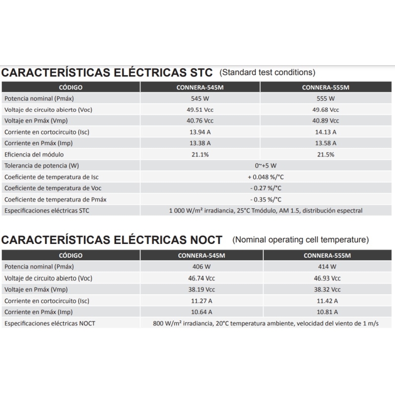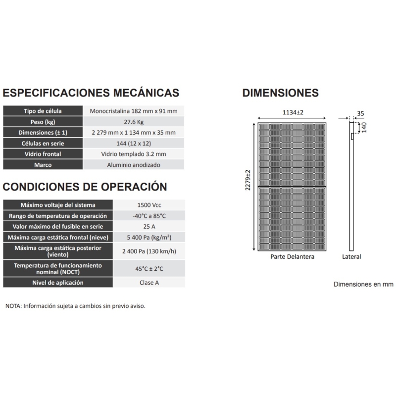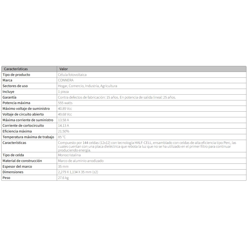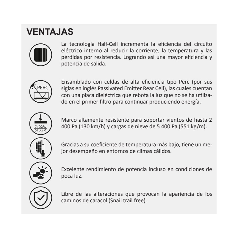 - CaracterÃsticas: Compuesto por 144 celdas (12x12) con tecnologÃa HALF-CELL, ensamblado con celdas de alta eficiencia tipo Perc, las cuales cuentan con una placa dieléctrica que rebota la luz que no se ha utilizado en el primer filtro para continuar produciendo energÃa.