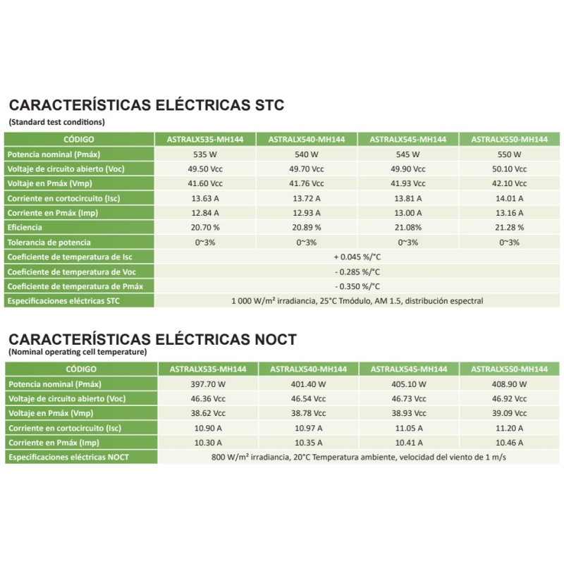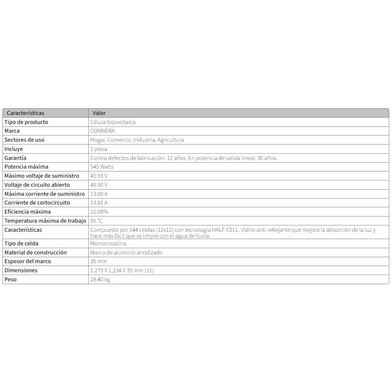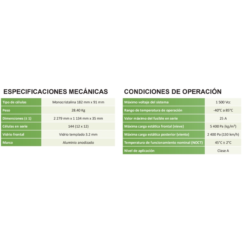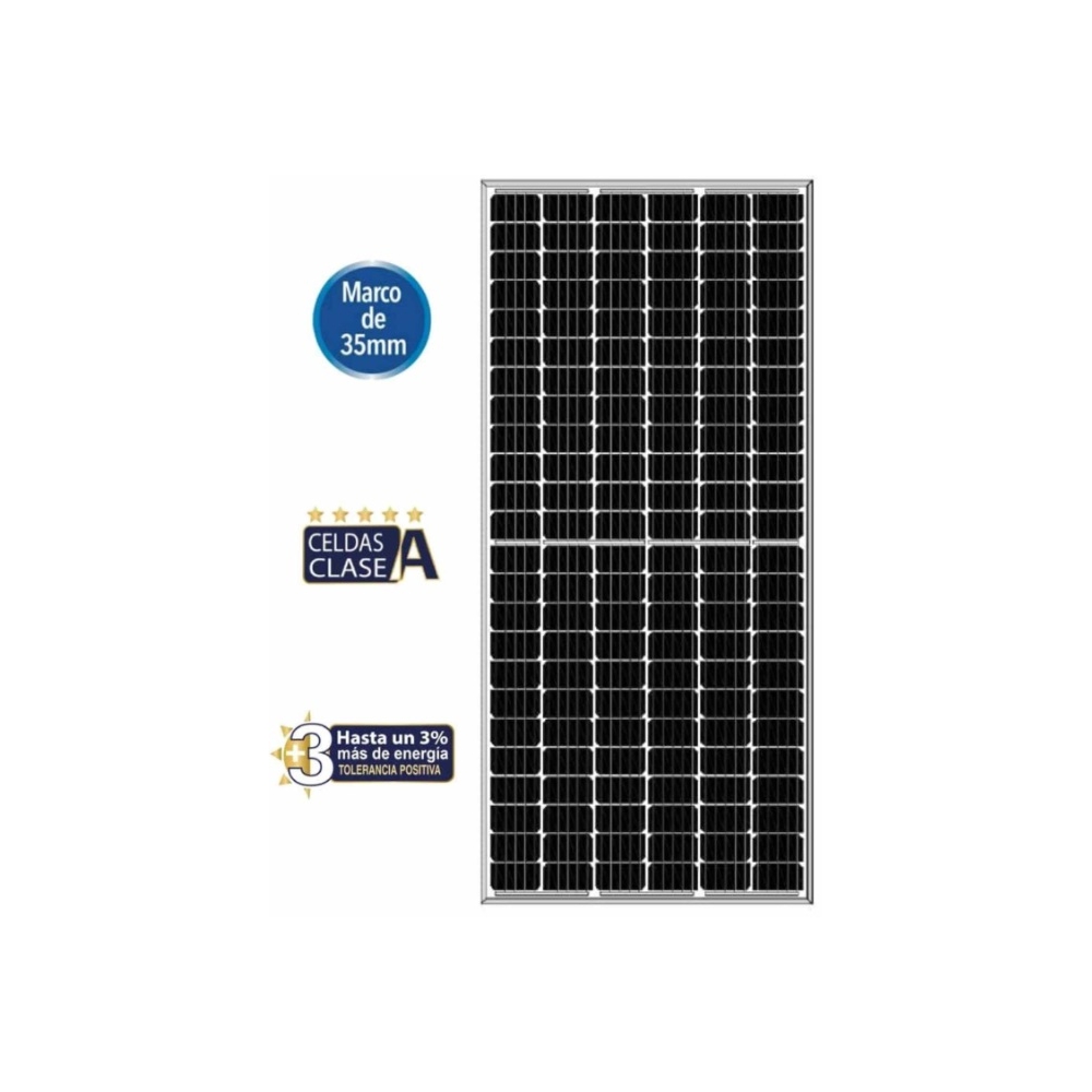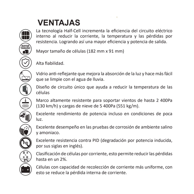 • Caracter铆sticas: Compuesto por 144 celdas (12x12) con tecnolog铆a HALF-CELL, Vidrio anti-reflejante que mejora la absorci贸n de la luz y hace m谩s f谩cil que se limpie con el agua de lluvia.