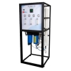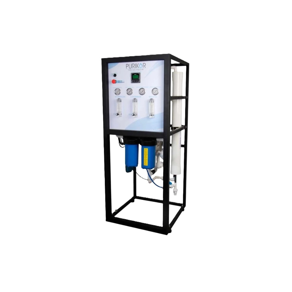 Sistema de Osmosis Inversa integrado bajo la marca PURIKOR, con un tren de tratamiento integrado compuesto por motobomba en acero inoxidable multietapas para mediana presión, 2 filtros de cartucho previos a las membranas de Osmosis Inversa tipo ULP (Ultra Baja Presión), integrada con 3 válvulas de aguja en acero inoxidable y 4 manómetros para una calibración óptima, así como sus controles electrónicos para un óptimo desempeño en la producción de agua purificada. Es un sistema muy completo y fácil de operar y calibrar.