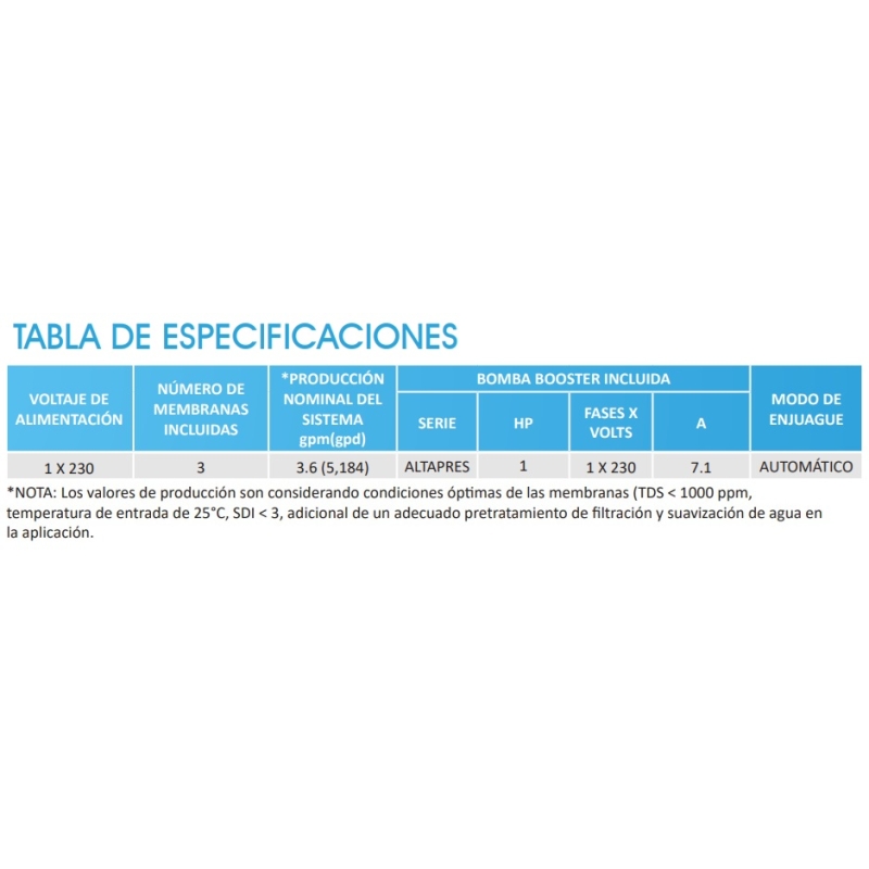 Caudal estimado de agua de producto: 13.6 litros por minuto.