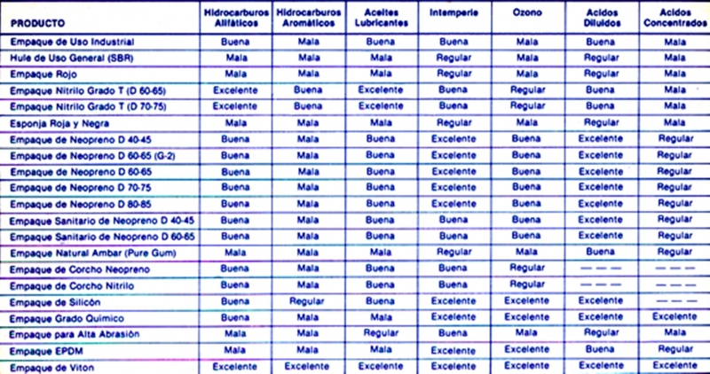 Esta Tabla te puede servir para darte una idea sobre las resistencias, a determinados quÃmicos, de los hules y cauchos. Espero que te sea de utilidad. Solo da klic en Ampliar foto...... Si requieres consultar un uso más especifico, contactanos!