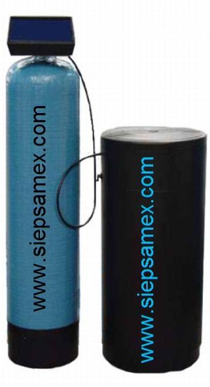 • Cabezal Automático programable por tiempo o consumo, tanque de fibra de vidrio 10x54", 1.5 ft3 de resina cationica de intercambio ionico, tubo sifón, tanque de salmuera con válvula y conector integrado