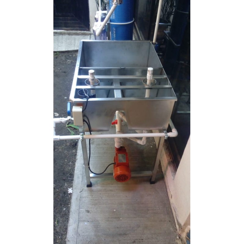 Lavadora de garrafones en acero inoxidable con bomba y apagador integrado,2 tinas de lavado interno, 2 tinas de enjuagado interno con agua purificada, y tina de lavado externo y enjuagado externo con agua purificada.