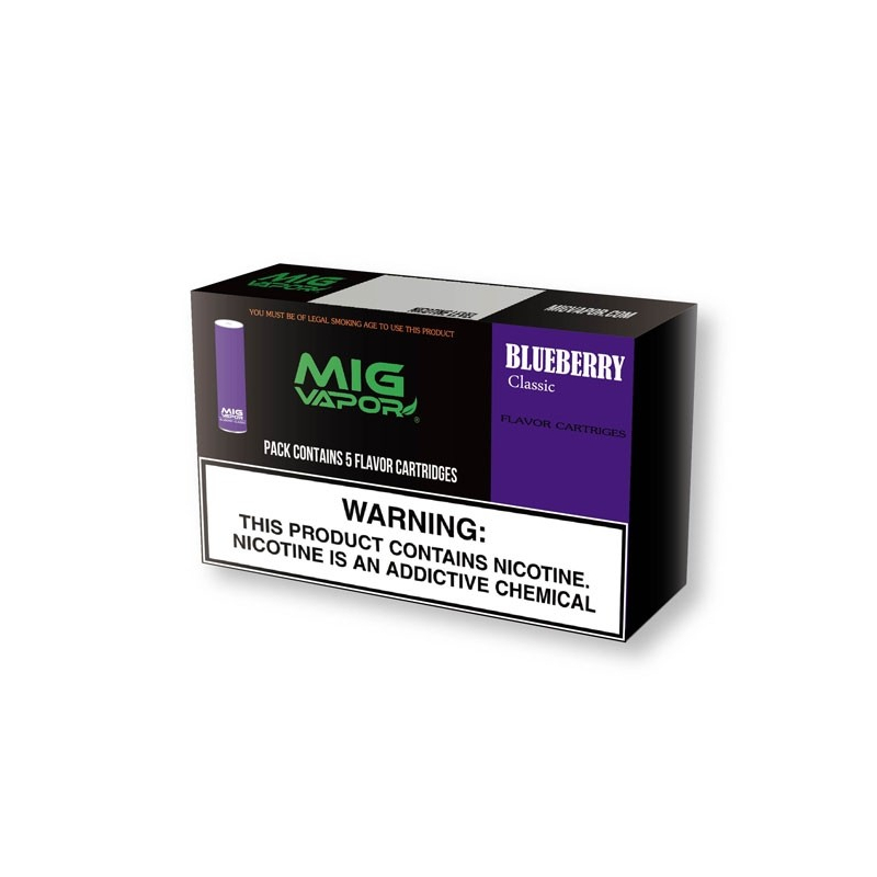 Los cartuchos de arándanos de Mig Vapor son compatibles con todos los cigarrillos electrónicos con rosca KR808D1 y están disponibles en 50 mg (5.0% de nicotina), 24 mg (2.4% de nicotina), 18 mg (1.8% de nicotina), 12 mg (1.2% de nicotina), 6 mg (0.6% de nicotina) ), y 0mg (sin nicotina).