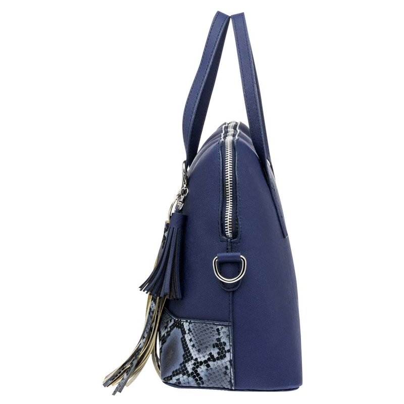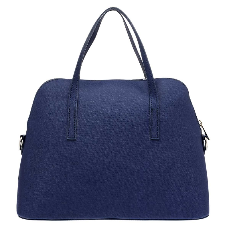 Con buen espacio interior. Rígida en su aspecto, pero suave al tacto. Doble asa. Con cierre de acero en la parte superior. Correa para llevar al hombro y pequeño detalle colgante al frente.