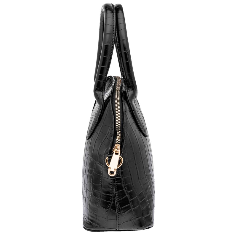 Con buen espacio interior. Rígida en su aspecto, pero suave al tacto. Doble asa. Con cierre de acero en la parte superior. Correa para llevar al hombro.