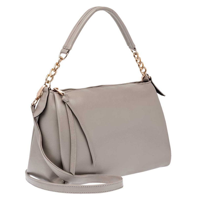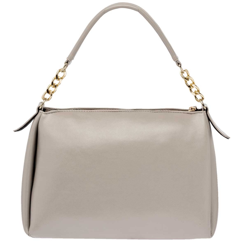 Con buen espacio interior. Suave al tacto. Tapa en forma de cubierta. Asa con detalles de acero. Cierre superior externo con detalle colgante. Correa para llevar al hombro.