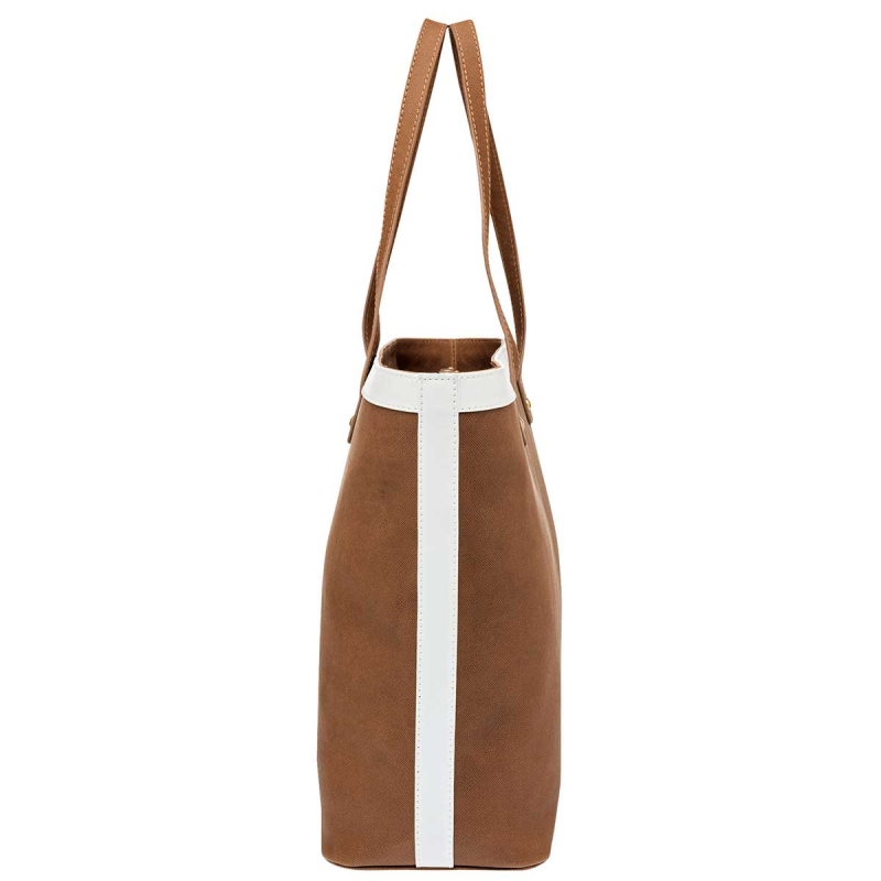 Por su tamaño cuenta con gran espacio interior. Doble Asa. Con elegante línea blanca en el cuerpo. Cierre superior de acero en la parte interna. Dije incrustado al frente.