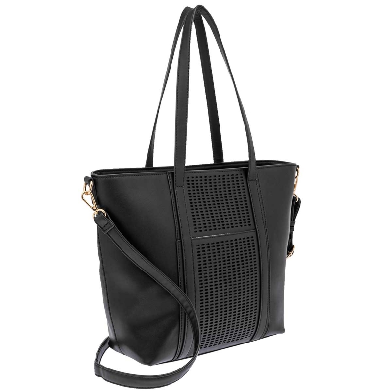 Elegante. Con gran espacio interno. Detalle tipo malla al frente. Bolsillo trasero. Cierre metálico en la parte superior. Asa y correa desmontable.
