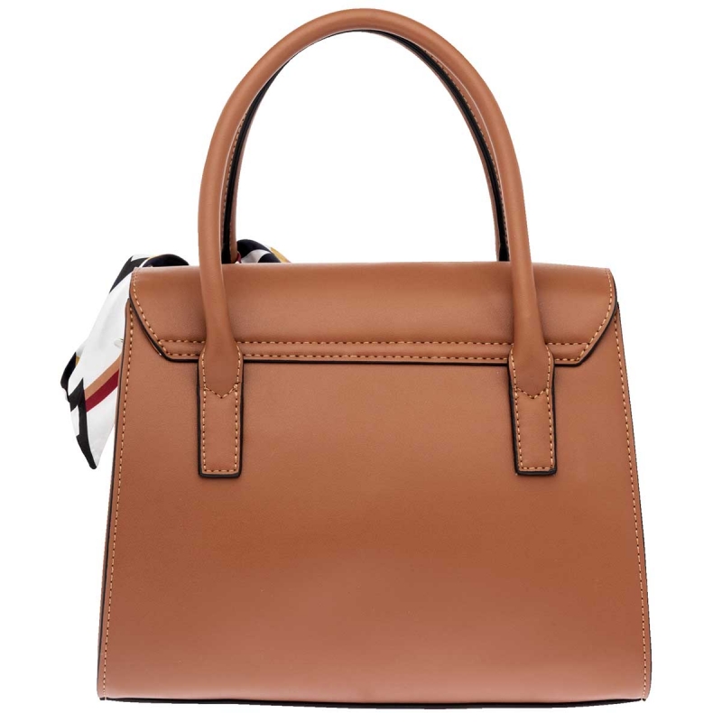 Tipo Casual. Con buen espacio interno. Rígida en su forma, pero suave al tacto. Con doble asa y correa desmontable. Con tapa tipo cubierta y broches al frente. Incluye mascada.