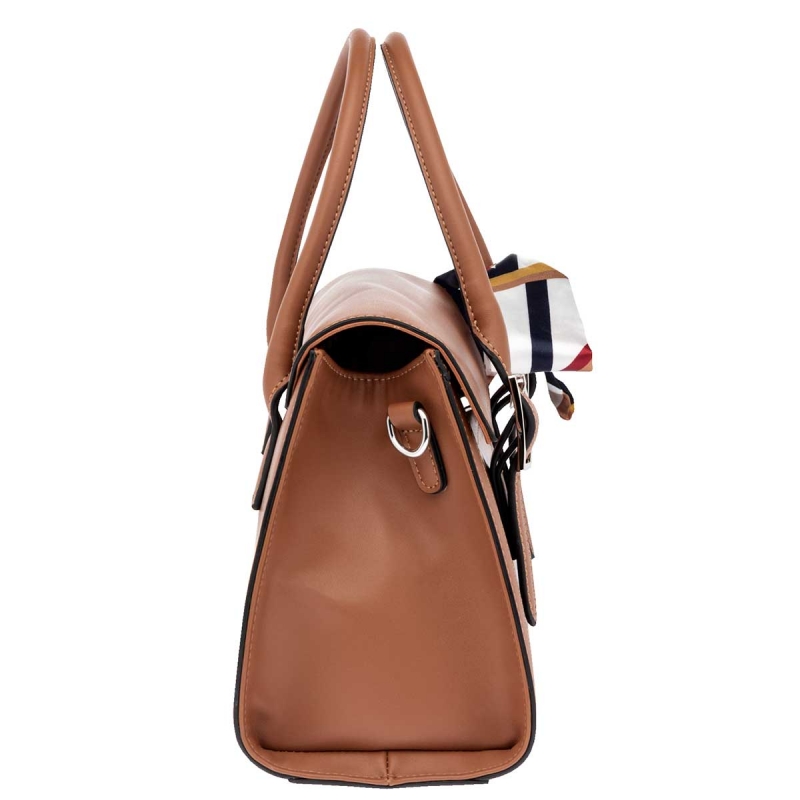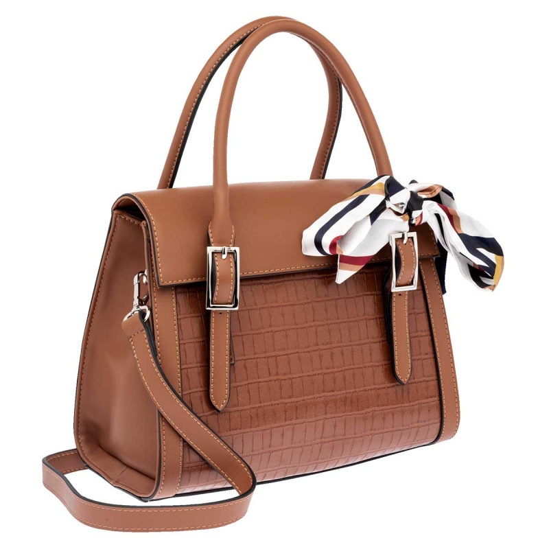 Tipo Casual. Con buen espacio interno. Rígida en su forma, pero suave al tacto. Con doble asa y correa desmontable. Con tapa tipo cubierta y broches al frente. Incluye mascada.