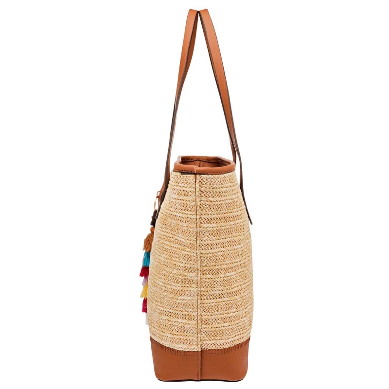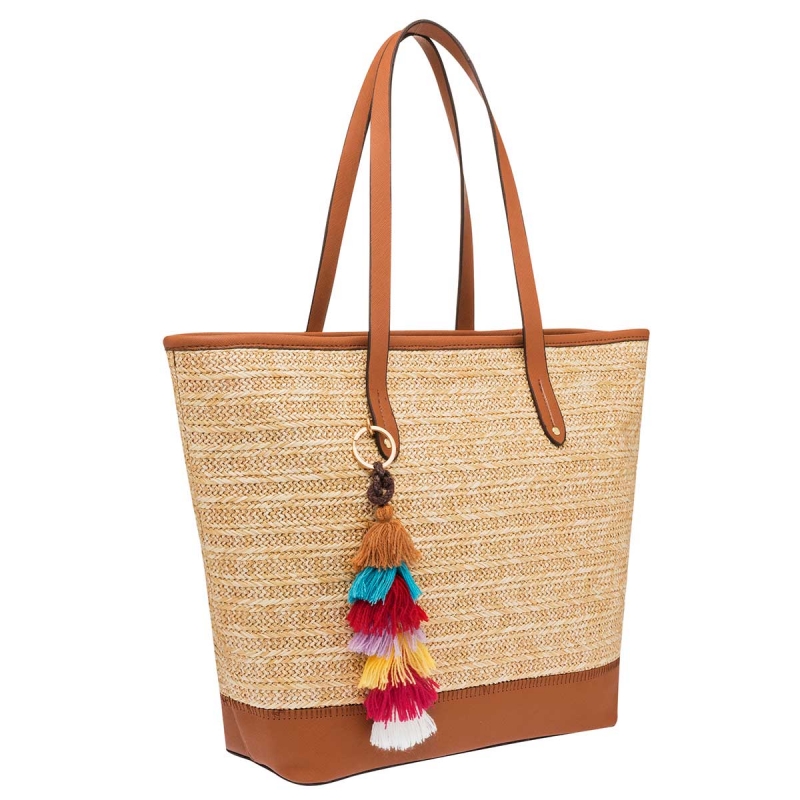 Con gran espacio interior. Cuerpo Suave tipo Yute. Con cierre en la parte superior. Doble Asa. Detalle colgante al frente. Por su diseño puede usarse en paseos o salidas casuales.