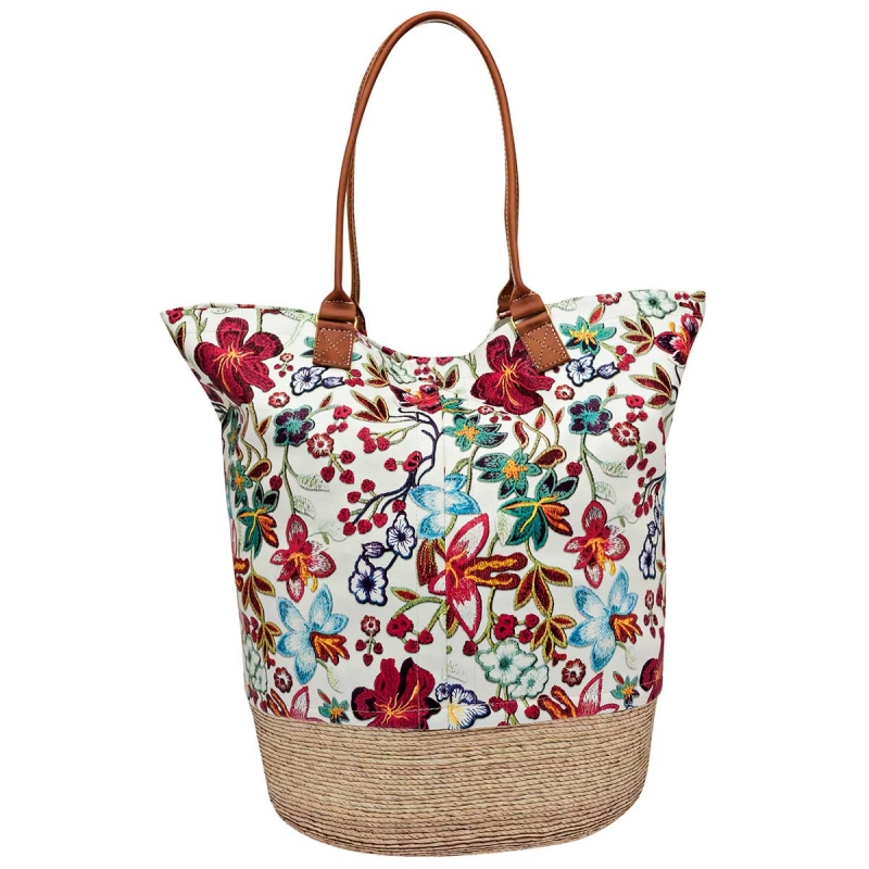 Con gran y amplio espacio interior. Cuerpo Suave tipo Yute. Con detalles florales bordados en toda su forma y dos mechas colgantes al frente. Doble Asa. Por su diseño puede usarse en paseos o salidas casuales.