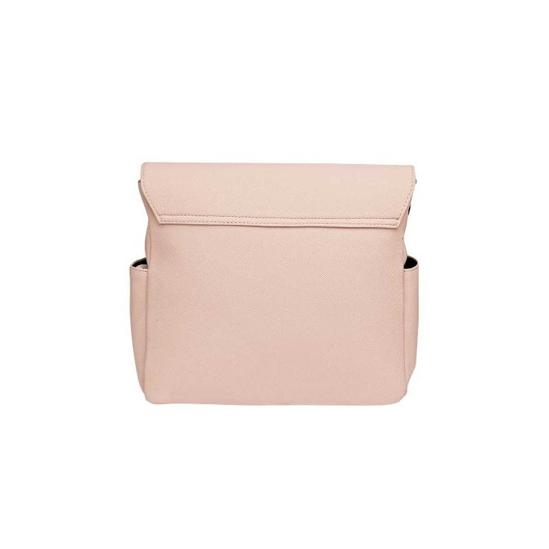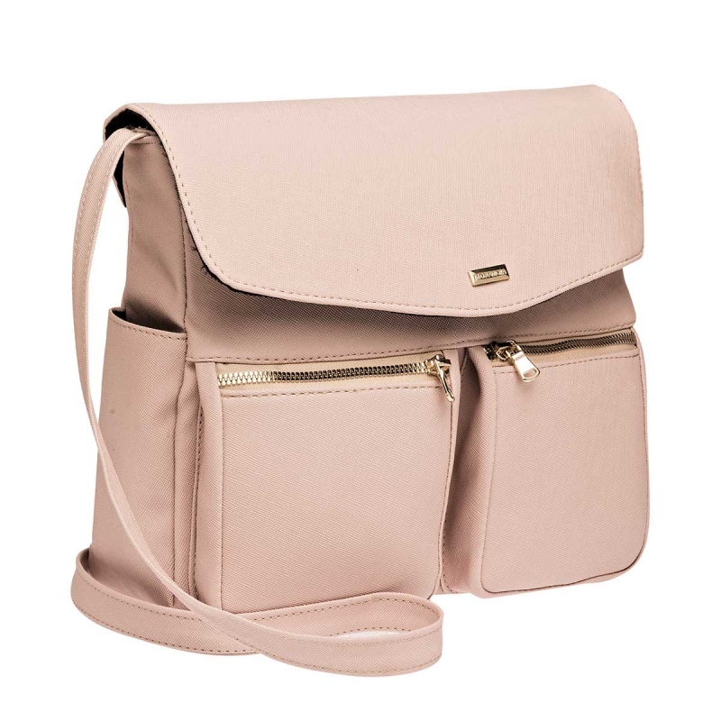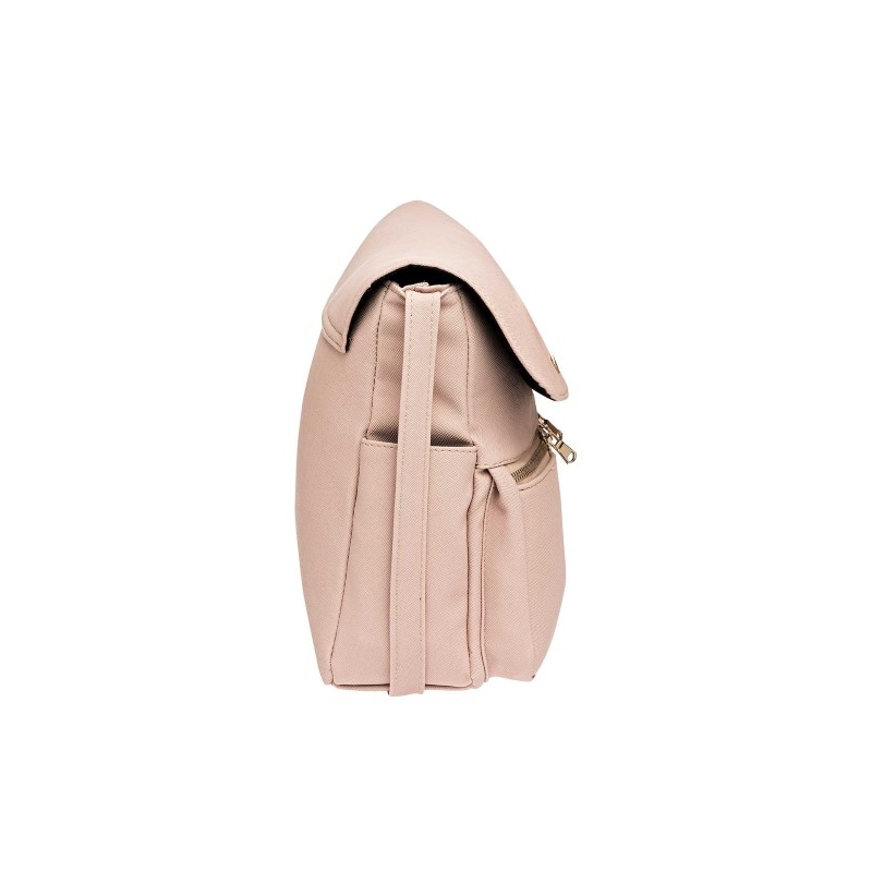 De aspecto rígido pero suave al tacto. Con gran espacio interior. Forro por dentro, con compartimiento. Dos bolsas frontales con cierre de acero. Dos bolsas laterales. Tapa tipo cubierta. Correa ajustable para llevar al hombro o cruzada.