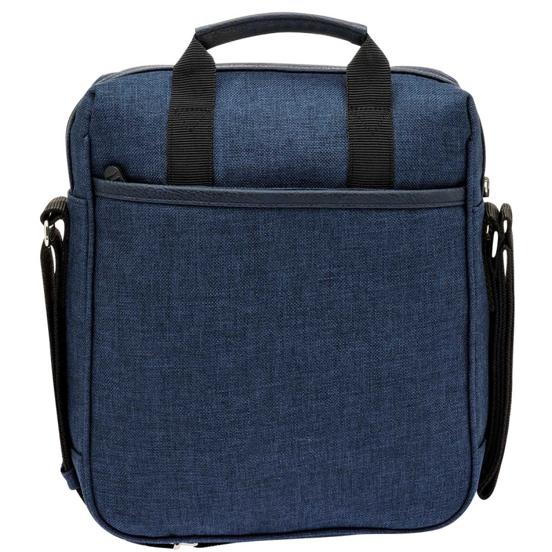 De estilo Formal-Casual. Rígido pero suave al tacto. Tela tipo mezclilla. Cierre en la parte alta. De gran espacio interior. Con bolsa frontal. Bolsa amplia en la parte trasera. Forro interno. Asa y correa de seguridad ajustable para llevar al hombro o crudada.