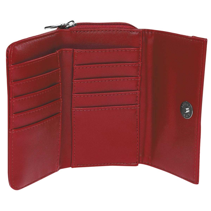 Con gran espacio interior. Abertura tipo libro. Cuenta con multiples compartimientos para billetes o tarjetas. Bolsillo exterior de cierre. Tapa tipo cubierta con broche. Suave textura al frente. Para un uso Formal o Casual.