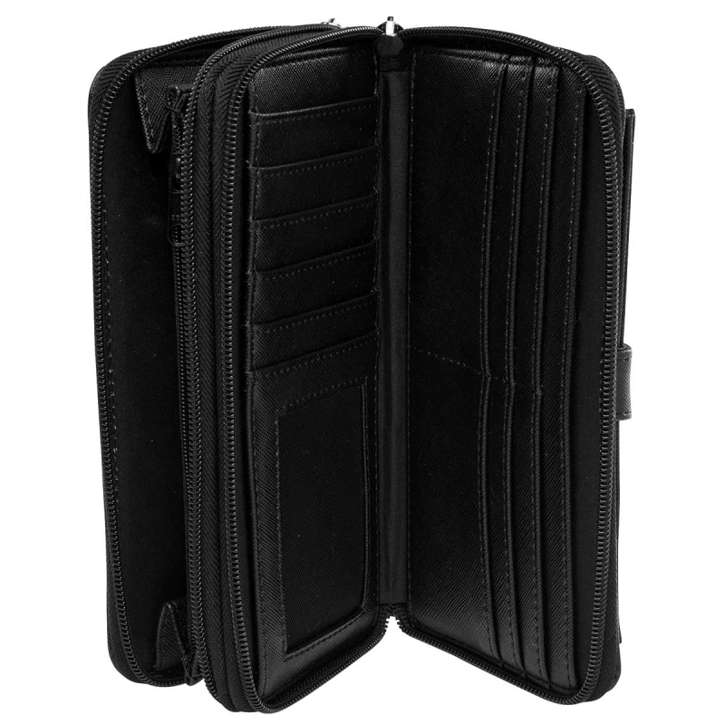 Con amplio espacio interior. Abertura con cierres. Doble área disponible. Cuenta con multiples compartimientos para billetes o tarjetas. Bolsillo exterior con broche. Detalles metalizados. Para un uso Formal o Casual.