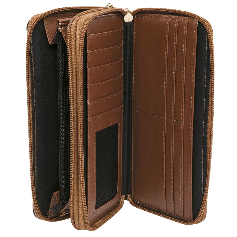 Con amplio espacio interior. Abertura con cierres. Doble área disponible. Cuenta con multiples compartimientos para billetes o tarjetas. Bolsillo interno. Detalles metalizados. Para un uso Formal o Casual.