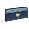 Rígida. Repelente. Con dos divisiones en su interior y multiples compartimientos para billetes o tarjetas. Cierre de acero y dije incrustado al frente.