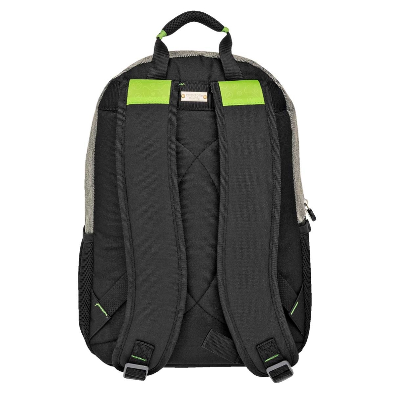 Con amplio espacio interior y bolsa frontal de cierre. Bolsillos de red a los costados. Respaldo acojinado y correas cómodas.
